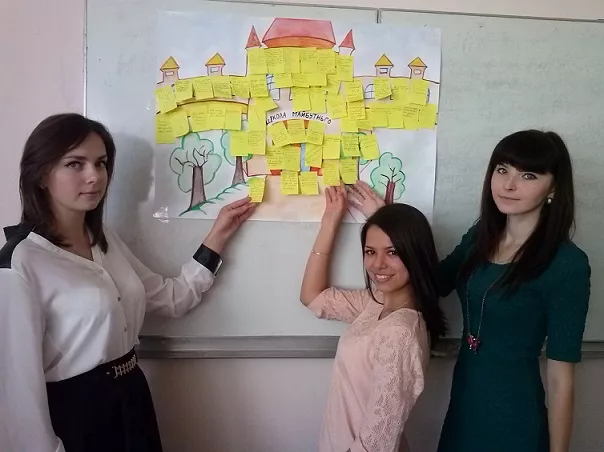 Наприкінці засідання присутні (студенти ІІ–ІV курсів спеціальності «Початкова освіта») висловити власні думки щодо того, якою вони хотіли б бачити школу майбутнього, записуючи їх на стікерах і розміщуючи на малюнку «Школа майбутнього».
