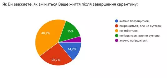 Щодо очікувань до життя після скасування карантину, то 40,7 % вважають, що воно «не зміниться»; 15 % зазначають, що «погіршиться, але не суттєво»; песимістично налаштовані лише 4,4 % респондентів, які обирають варіант «значно погіршиться».