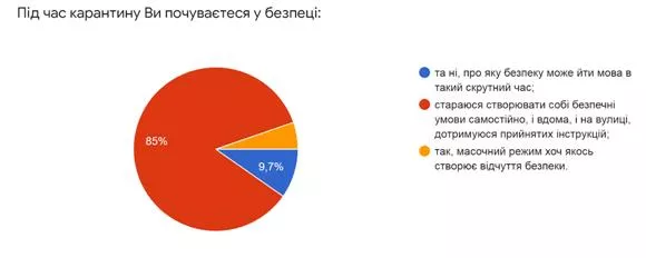 Щодо відчуття безпеки, то 85 % опитаних «стараюся створювати собі безпечні умови самостійно і вдома, і на вулиці, дотримуватися прийнятих інструкцій»; 9,7 % стверджують, що про жодну безпеку «не може йтися в такий скрутний час»; 5,3 % говорять про те, що «масочний режим хоч якось створює відчуття безпеки».
