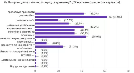 На запитання «Як Ви проводите свій час у період карантину» 37,2 % і 54,9 % відповідно «продовжують працювати дистанційно» та «продовжують навчатися дистанційно»; 38,9 % «спілкуються з рідними та близькими» та «займаюся хатніми справами»; саморозвиваються 25,7 % респондентів; 8,8 % «стараються знайти можливості для підробітку, оскільки я та моя сім’я відчуваємо нестачу матеріальних ресурсів»; достатньо велика кількість (30,1 %) «сидить у соціальних мережах».