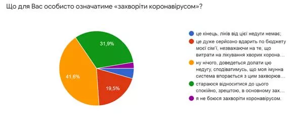 «Захворіти коронавірусом» для 41,6 % опитаних – це «нічого, доведеться долати цю недугу, сподіватимуся, що моя імунна система впорається»; 31,9 % «стараються ставитися до цього спокійно, зрештою, в основному захворювання протікає легко, іноді навіть безсимптомно, лише незначній частині хворих потрібна госпіталізація»; 4,4 % вважають, що «це кінець, ліків від цієї недуги немає»; 2,7 % «не бояться захворіти коронавірусом».