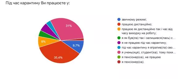 Під час карантину 35,4 % опитаних «працюють дистанційно», 8 % «працюють і дистанційно, і час від часу виходять на роботу»; «під час карантину втратили своє робоче місце» 3,5 %.