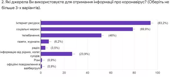 Зазвичай джерела отримання інформації про коронавірус – інтернет-ресурси (83,2 %), телебачення (46 %), а також відомості від друзів і колег (23,9 %).