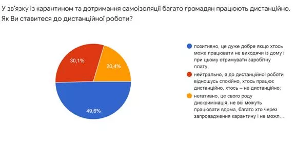 До дистанційної роботи «позитивно» ставиться 49,6 %, вважаючи, що «це добре, якщо хтось може працювати, не виходячи з дому, і при цьому отримувати заробітну плату»; 30,1 % демонструють нейтральну позицію, зазначаючи, що «щодо дистанційної роботи спокійний, хтось працює дистанційно, хтось – не дистанційно»; 20,4 % осіб, що взяли участь в опитуванні, оцінюють дистанційну роботу «негативно», оскільки це «свого роду дискримінація, не всі можуть працювати вдома, багато хто через запровадження карантину і неможливість працювати дистанційно втратив роботу».