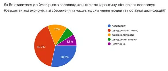 До ймовірного запровадження після карантину «touchless economy» (безконтактної економіки зі збереженням масочної системи у місцях скупчення людей і постійної дезінфекції) «позитивно» ставиться 28,3 % респондентів, «швидше позитивно» – 40,7 %, «негативно» – 8,8 %, ще не визначилися з відповіддю на запитання – 15 %.