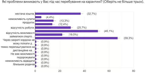 Значущими проблемами, які виникають під час перебування на карантині, на думку наших респондентів, є: «неможливість перебувати на свіжому повітрі» – 45,1 %, «нестача коштів» – 32,7 %, «відсутність роботи» – 25,7 %. На конфлікти у сім’ї вказує 12,4 % опитаних, на неможливість купити продукти – 13,3 %.