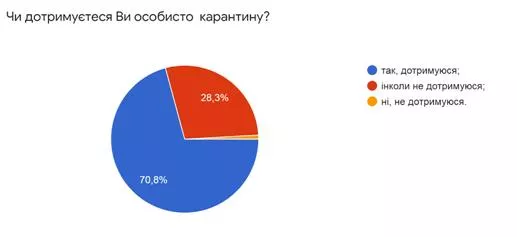 Загалом українці під час запровадження карантину зарекомендували себе відповідальними, дисциплінованими людьми. Таку ж тенденцію ми простежуємо й аналізуючи результати нашого онлайн-опитування: «так, дотримуюся карантину» відповіли 70,8 % респондентів, «ні, не дотримуюся» – лише 1 %.