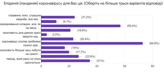 «Епідемія (пандемія) коронавірусу для Вас – це»: 64,6 % опитаних зазначають, що «коронавірус оголив проблеми кожної країни, зокрема й України, показав надзвичайно недосконалу систему охорони здоров’я»; варіант відповіді «захворювання складне, але, як на мене, інформація про нього дуже роздута засобами масової інформації» обирає 50,4 % респондентів; про те, що це «період, який рано чи пізно закінчиться», думає 31 %.