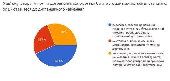 До дистанційного навчання позитивно ставиться 43,4 % респондентів, які акцентують на тому, що «головне – це бажання людини вчитися, тим більше, що сучасний інтернет-простір дає багато можливостей для самоосвіти»; 31 % налаштовані негативно і зазначають, що «дистанційне навчання – це не навчання, хоча б тому, що можливості контролю за процесом суттєво обмежені»; 25,7 дотримуються нейтралітету: «Якщо немає інших можливостей навчатися, то можна і дистанційно».