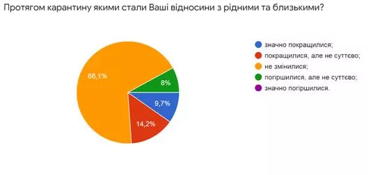 На запитання «Якими стали Ваші відносини з рідними та близькими під час карантину» 68,1 % зазначають, що «не змінилися», для 14,2 % – «покращилися, але не суттєво», для 8 % – «погіршилися, але не суттєво».