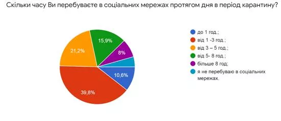 До слова, 94,7 % респондентів, що взяли участь в опитуванні, користуються соціальними мережами. Із них 39,8 % – «від 1 до 3 годин», 15,9 % – «від 5 до 8 годин».