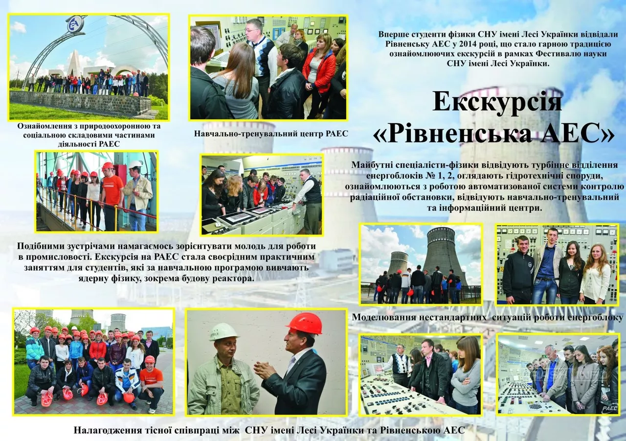 Ознайомчі екскурсії на Рівненську АЕС – одна з хороших традицій для колективу та студентів Навчально-наукового фізико-технологічного інституту. В інформаційному центрі «Полісся» молоді демонструють макети енергоблоків із реакторами ВВЕР, муляжі паливної таблетки й імітатор касети, розповідають історичні факти будівництва РАЕС та її міста-супутника.
