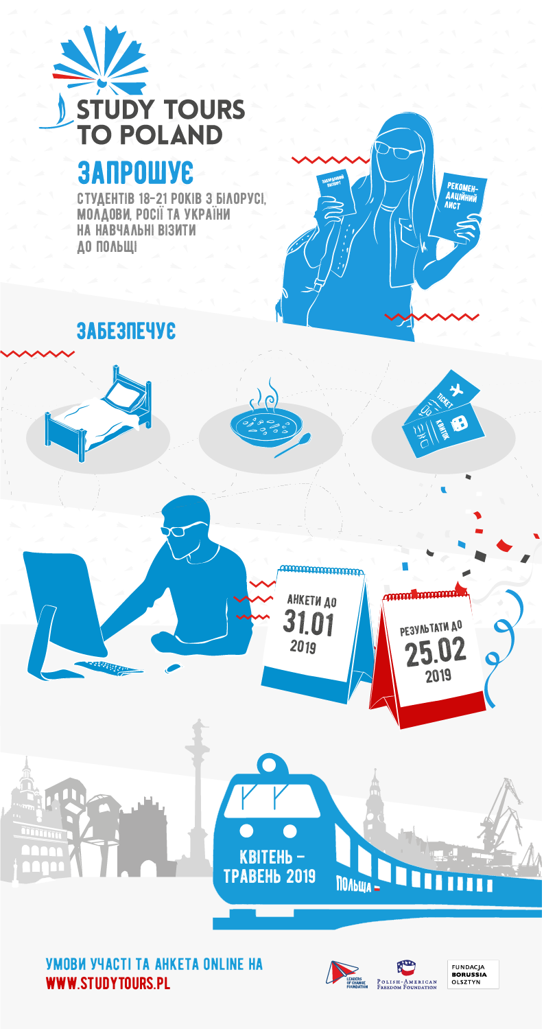 «Study Tours to Poland» – це півтора тижня інтенсивної, пізнавальної праці в міжнародній групі, під час якої учасники отримають нові знання та вміння, познайомляться з цікавими людьми, відвідають заходи неформальної освіти. Але це не лише отримання нового досвіду, а й передача власного.