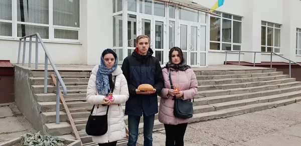 Дівчата і хлопці тримали запалені свічі та калач білого хліба. Кожен, хто заходив у навчальний корпус на навчання, зупинявся у скорботі та відламував шматок хліба.