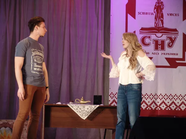 Перед глядачами, а їх у залі було чимало, постала чудова історія про чарівну лампу та щирі почуття закоханих, дружбу. У виставі замість джина глядачі побачили джинні. Вистава була поділена на кілька частин, про зміст кожної з них глядачам переповідала ведуча дійства – випускниця факультету міжнародних відносин Ганна Кримська.