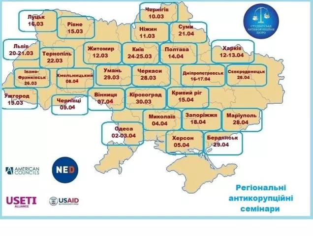 Студентське антикорупційне бюро за підтримки USAID, USETI, NED та Американських рад з міжнародної освіти розпочало серію регіональних антикорупційних семінарів. За два місяці планується провести заходи в 28 містах України.