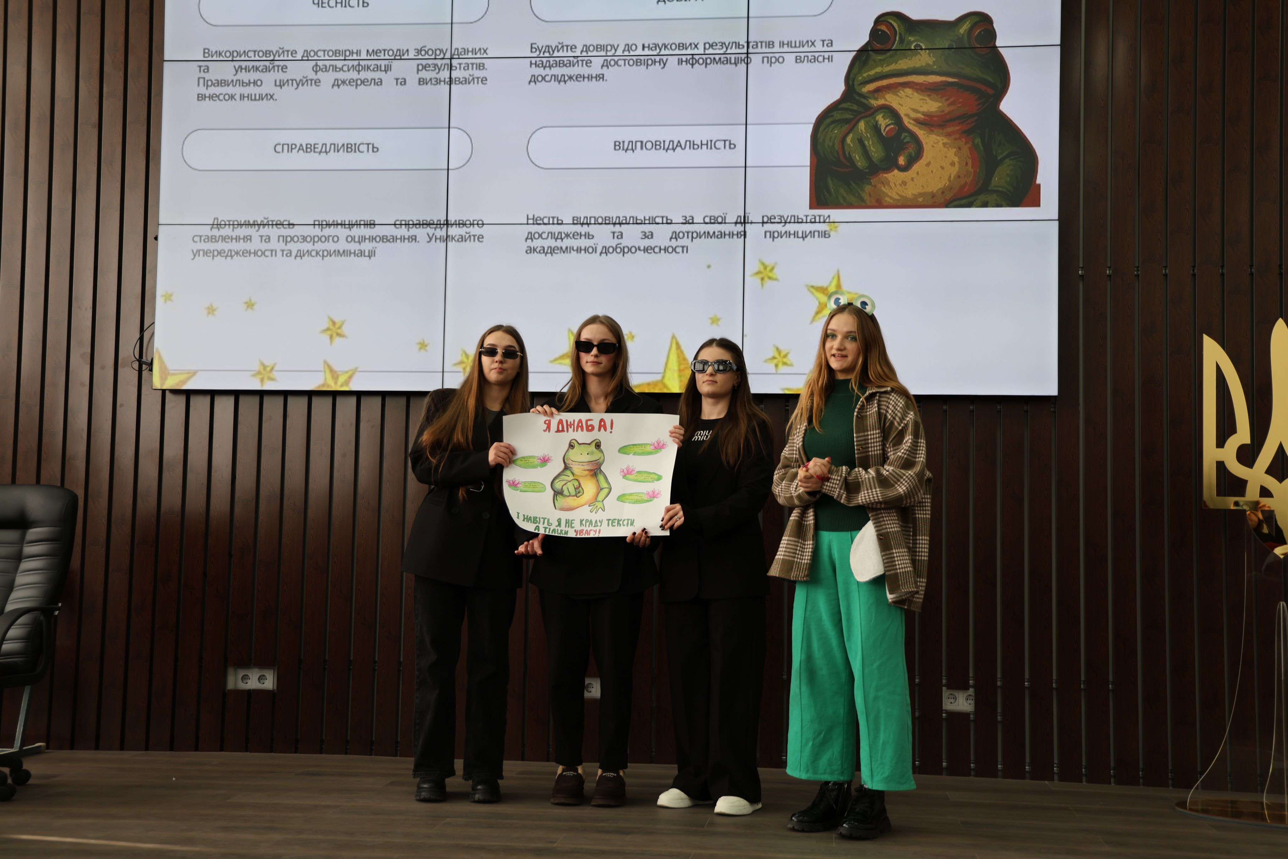 Під час презентацій учасники проявили креативність і поділилися власним баченням академічної культури. Факультет історії, політології та національної безпеки представив постер, який через порівняння двох студентів нагадав: академічна доброчесність – це не просто правила, а справжній кодекс честі.