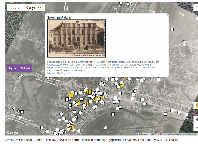 Другий складник – це аерофотознімок Луцька часів Другої світової війни, який накладено на карту Google Map. Завдяки легкому переходу між ними можна дізнатися наскільки змінилося місто за понад 70 років, побачити історичні забудову, парки та дороги, що було на місці популярних нині міських локацій: біля пам’ятників Лесі Українки на Театральному майдані, Т. Шевченку чи монумента М. Грушевському».