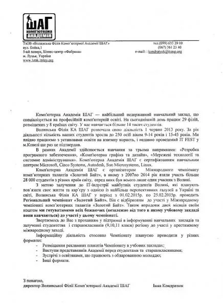 З 1 по 25 лютого 2015 року Комп’ютерна академія «ШАГ» проводитиме в м. Луцьку регіональний чемпіонат «Золотий байт». Він є відбірковим етапом Міжнародного чемпіонату комп’ютерних талантів «Золотий байт».