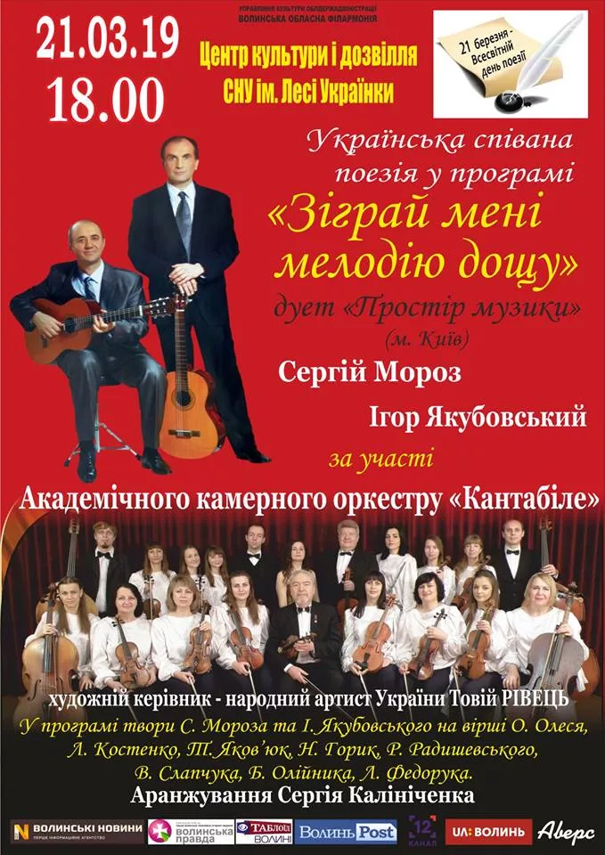 До Всесвітнього дня поезії (21 березня) дует «Простір музики» (м. Київ) і Академічний камерний оркестр «Кантабіле» Волинської обласної філармонії пропонують волинянам програму «Зіграй мені мелодію дощу». 20 березня о 15-й годині концерт відбудеться у Нововолинську (Центр художньої і технічної творчості), а 21 березня о 18-й годині у Східноєвропейському національному університеті імені Лесі Українки (Центр культури і дозвілля на вул. Винниченка, 30).