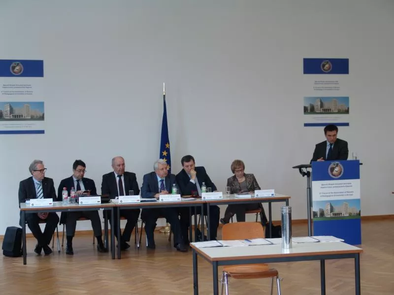 Президент Асоціації ректорів педагогічних університетів Європи Віктор Андрущенко виголосив концептуальну доповідь Форуму, тематикою якої стали ідейні засади Педагогічної Конституції Європи як духовної платформи підготовки Нового вчителя. «Наш проект – відповідь на вимогу часу. Це пошук ресурсів, шляхів і технологій взаєморозуміння і співпраці. Це – конкретний крок і конкретна справа, яка, ми певні, принесе абсолютно конкретний результат», – зазначив Віктор Петрович.