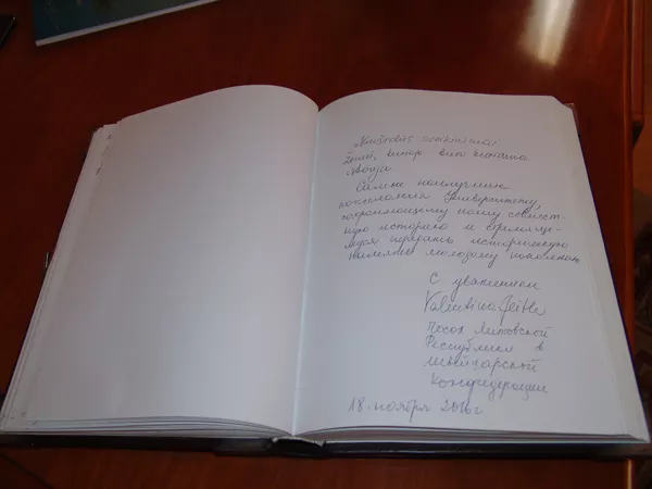 На завершення розмови Ігор Ярославович подарував презентаційні видання про СНУ імені Лесі Українки, подякував за візит. Натомість Валентина Цайтлер теж презентувала керівництву університету свою книгу про князя Свидригайла. Свої враження про візит до університету та побажання його колективу та студентству відобразила у книзі почесних гостей.