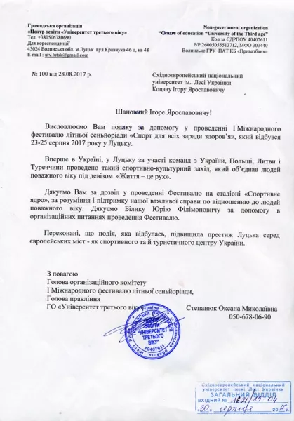 У листі висловлюється подяка ректору Ігорю Коцану за допомогу в проведенні І Міжнародного фестивалю літньої сеньйоріади «Спорт для всіх заради здоров’я», який відбувся на стадіоні «Спортивне ядро» 23–25 серпня 2017 року.