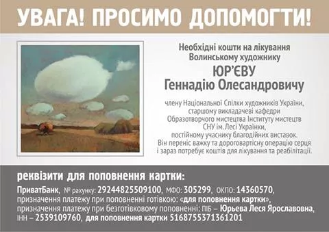 від redactor, 8 квітня, 2014 Переглянути на сайті Description Волинському художнику необхідні кошти на лікування та реабілітації. Type Type Суспільство