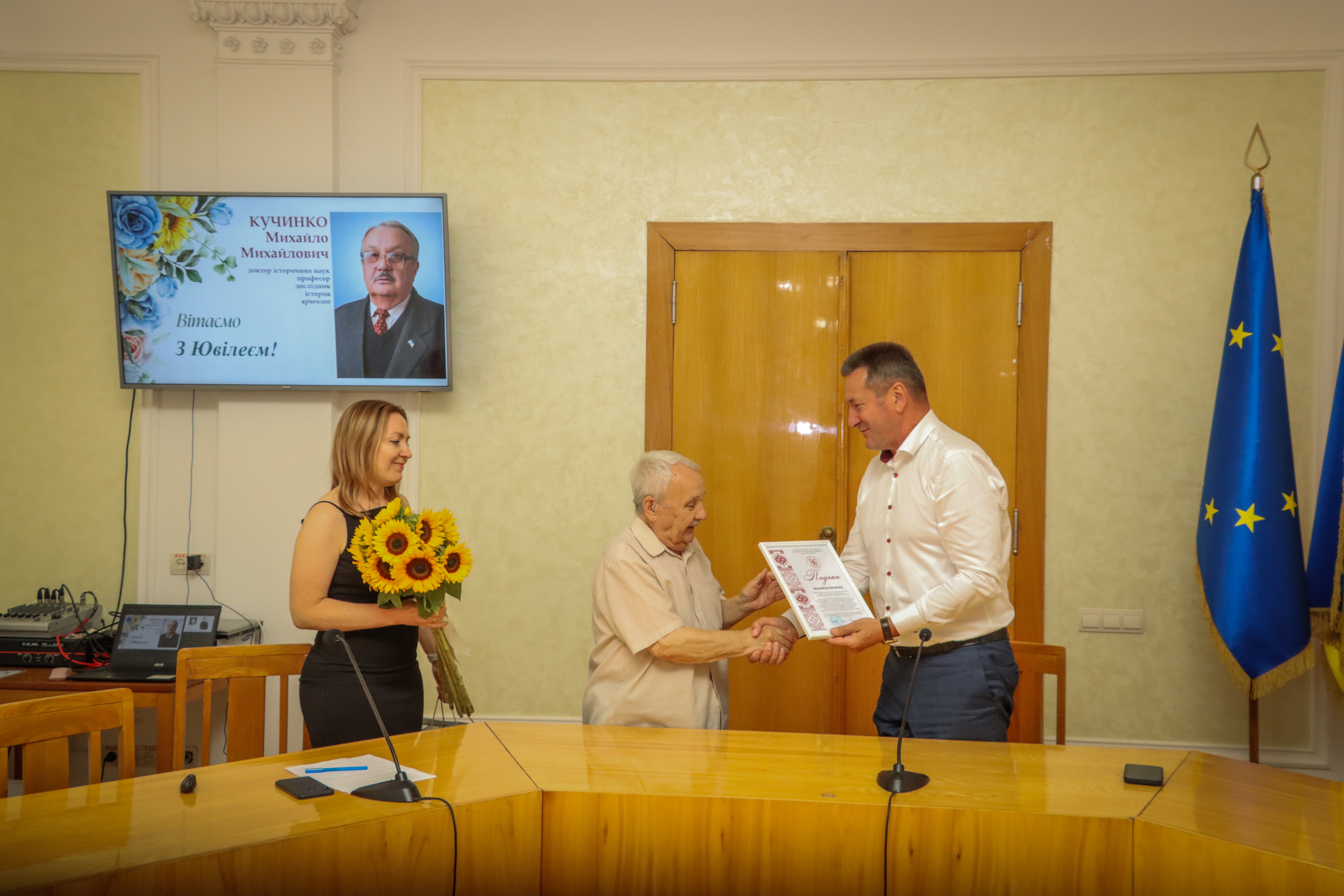 Михайло Михайлович із 2021 року офіційно на пенсії, утім, до того працював у нашому ЗВО впродовж 50 років. Винуватця дійства зі святом привітав ректор Анатолій Цьось. Очільник Університету згадав, що саме Михайло Кучинко був рецензентом його докторської дисертації.