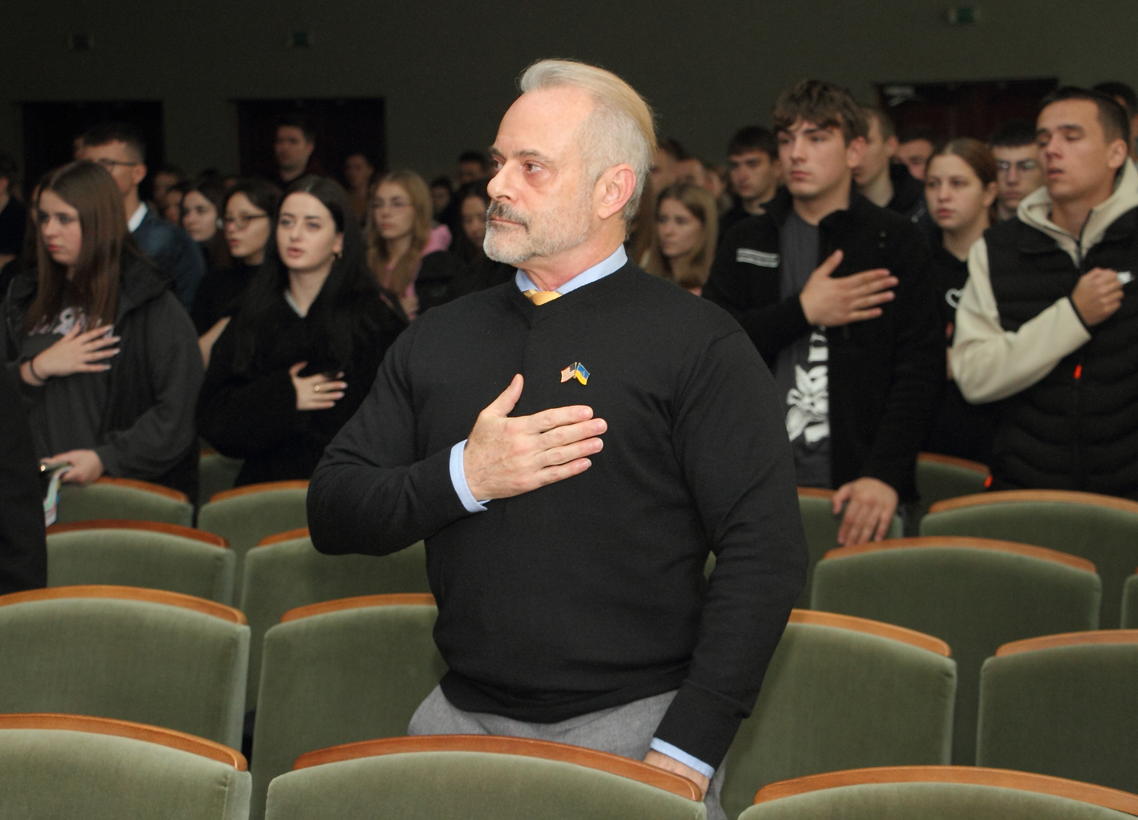 До привітань долучився й Ерік Путціг, який підкреслив важливість юриспруденції як основи правової держави: «Ви маєте надзвичайну відповідальність, оскільки представляєте Україну, яка розвивається і відстоює свої інтереси та права громадян. Ви маєте повноваження на це. Ви рухаєте людську еволюцію та робите Україну сильнішою». Декан факультету Антон Демчук допомагав зі синхронним перекладом виступу.