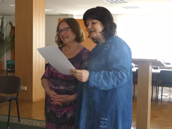 21 травня з нагоди V року навчання в Акме-Університеті у бібліотеці Лесиного вишу відбулася святкова зустріч. Молодих душею і надзвичайно активних у творчому мисленні людей – слухачів згаданого університету представила незмінна ведуча урочистих дійств та імпрез, методист книгозбірні СНУ Світлана Кресак. На жаль, керівник проекту – декан факультету психології та соціології, доктор психологічних наук, професор Жанна Вірна, – з поважних причин не змогла бути присутньою на святі, тож із вітальним словом до слухачів Акме-Університету звернулися заступник декана з навчальної роботи, кандидат психологічних наук, доцент Оксана Іванашко, голова самоуряду університету (чи «польовий ректор», як її любовно кличуть студенти) Катерина Маркевич та її перший заступник Людмила Сімон.