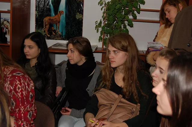 Під запашні аромати кави й чаю дівчата читали свою щиро-сповідальну поезію, яка проймала до кісток жіночою відвертістю, філософською зрілістю, інтимним струменем. Ольга Ляснюк – голова Волинської обласної організації творчої молоді «Лесин кадуб», редактор за професією і поет за покликанням. Авторка книг «Босоніж у вічність», «Третє бажання», «Аналогія», «Поцілунки у скло» поділилася із присутніми найбільш наболілим – віршами про війну, а також інтимно-щемливими поезіями, у яких виразно проступають життєва справжність і тривожні мотиви. Лауреат українсько-німецької премії імені Олеся Гончара, журналіст Софія Стасюк має серед творчих здобутків вже дві збірки – «Температура тиші» та «Екзекуції», які презентувала студентам. У римованих віршах та верлібрах поетеса зізналася, що знає, як «тиша цілується з небом», «капає час із порізаних артерій вічності», «дерева епіляцію роблять», вона «вимірює пульс на зап’ясті дверної ручки», «викручує з неба зорі, як лампочки з ліхтарів» та ще багато іншого. Не менш цікавим виявилося верліброве спілкування з поетесою Тетяною Бондар, яка нині працює вчителем української мови та літератури ліцею № 227 імені М. М. Громова м. Києва. Дівчина декламувала свої твори, що ввійшли до збірок «Святилище воскової ляльки» і «Переступивши дощ». Із поезій авторки присутні дізналися, що вона «не ходить, де чорні коти стежки вусами підмітають», «ловить місяця пульс сама», «хоче скраєчку біля місяця у твоє вікно світити». Новими творами порадувала слухацьку аудиторію нещодавня випускниця ІФтаЖ, але вже знана письменницькій громаді своїми літературними досягненнями поетеса Еліна Форманюк – авторка збірки віршів «По той бік веселки». Цікаво, що в одному зі своїх верлібрів дівчина просить, аби їй «скидали на емейл посмішки».