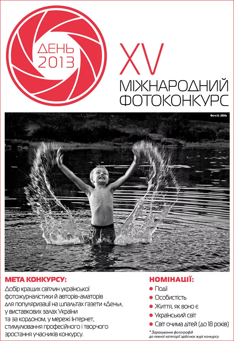 Газета «День» оголошує XV міжнародний фотоконкурс, мета якого – добір кращих світлин української фотожурналістики й авторів-аматорів для популяризації на шпальтах газети «День», у виставкових залах України та за кордоном, у мережі Інтернет, стимулювання професійного і творчого зростання учасників конкурсу.