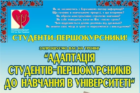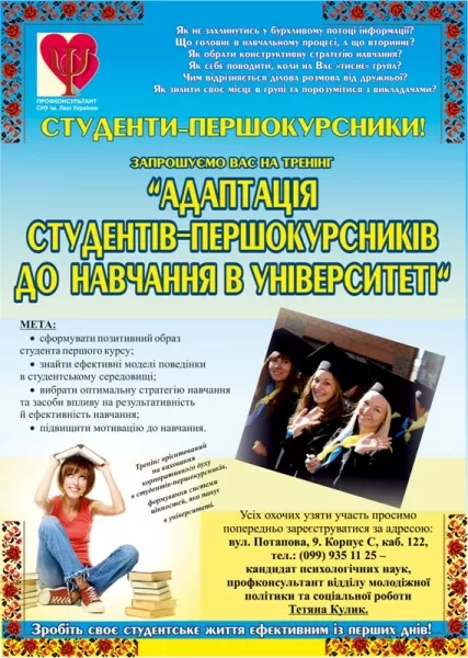 27 вересня кандидат психологічних наук, профконсультант відділу молодіжної політики та соціальної роботи Тетяна Кулик проведе тренінг «Адаптація студентів-першокурсників до освітнього закладу та навчального середовища в університеті».