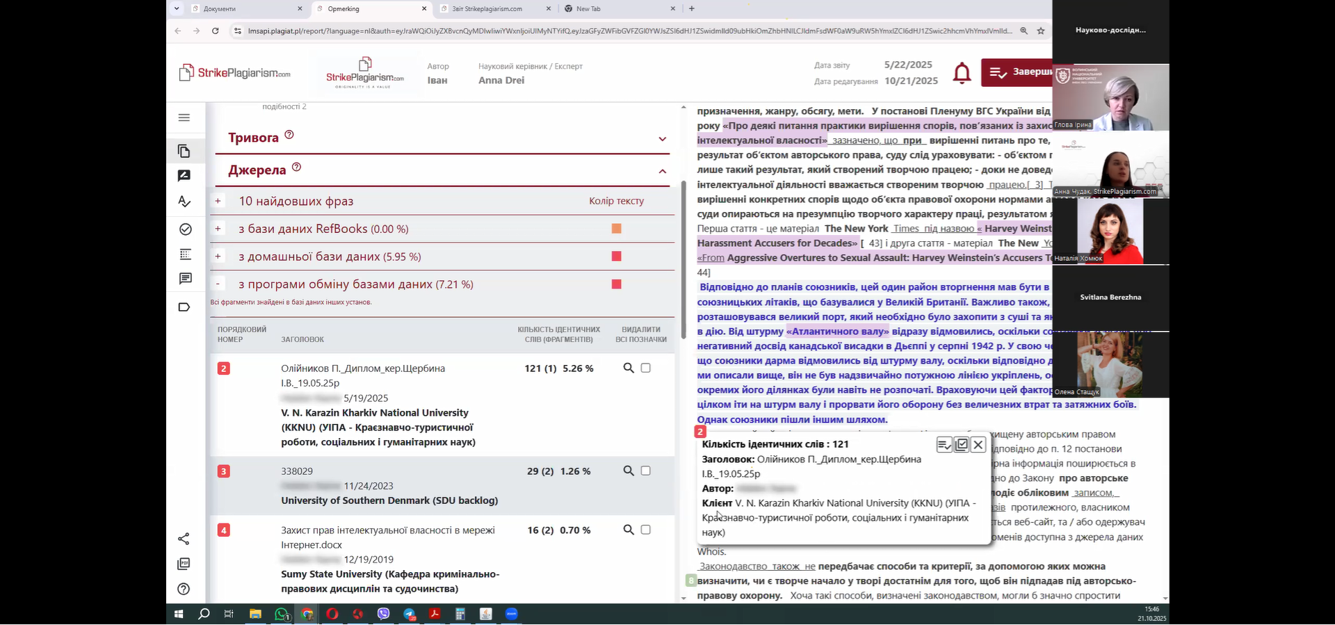 2) Презентація Звіту подібності StrikePlagiarism.com та його функціональні можливості. Модуль виявлення Штучного Інтелекту. Спікер заходу Анна Чудак, менеджерка з розвитку бізнесу StrikePlagiarism.com, презентувала учасникам способи відправлення документів на перевірку на плагіат в системі StrikePlagiarism, нові функціональні можливості звіту подібності та порядок його інтерпретації, додаткові можливості системи (звіт про наявність штучного інтелекту та перевірка текстів на наявність граматичних помилок).
