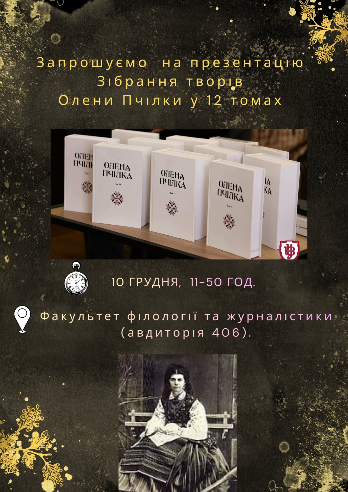 Викладачі факультету філології та журналістики, які готували до друку перше в історії Зібрання творів Олени Пчілки у 12 томах, запрошують на презентацію цього видання 10 грудня об 11:50.