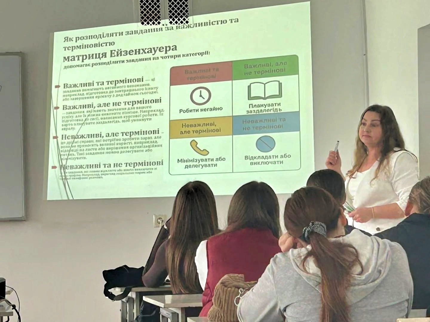 Під час інтерактивної зустрічі учасники дізналися, як розпізнавати прояви прокрастинації та ефективно з ними працювати, застосовувати техніку Pomodoro для підтримання концентрації й продуктивності, планувати свій час за допомогою матриці Ейзенхауера, знаходити баланс між навчанням, відпочинком і соціальними контактами, а також формувати внутрішню мотивацію як основу саморозвитку.