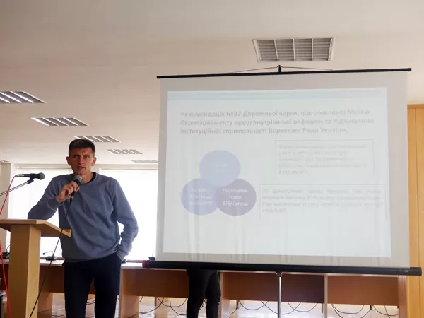Потому розпочалася презентація діяльності Програми РАДА в напрямі сприяння розвитку дослідницької служби парламенту, зокрема програми стажування при інформаційно-дослідницькому центрі.