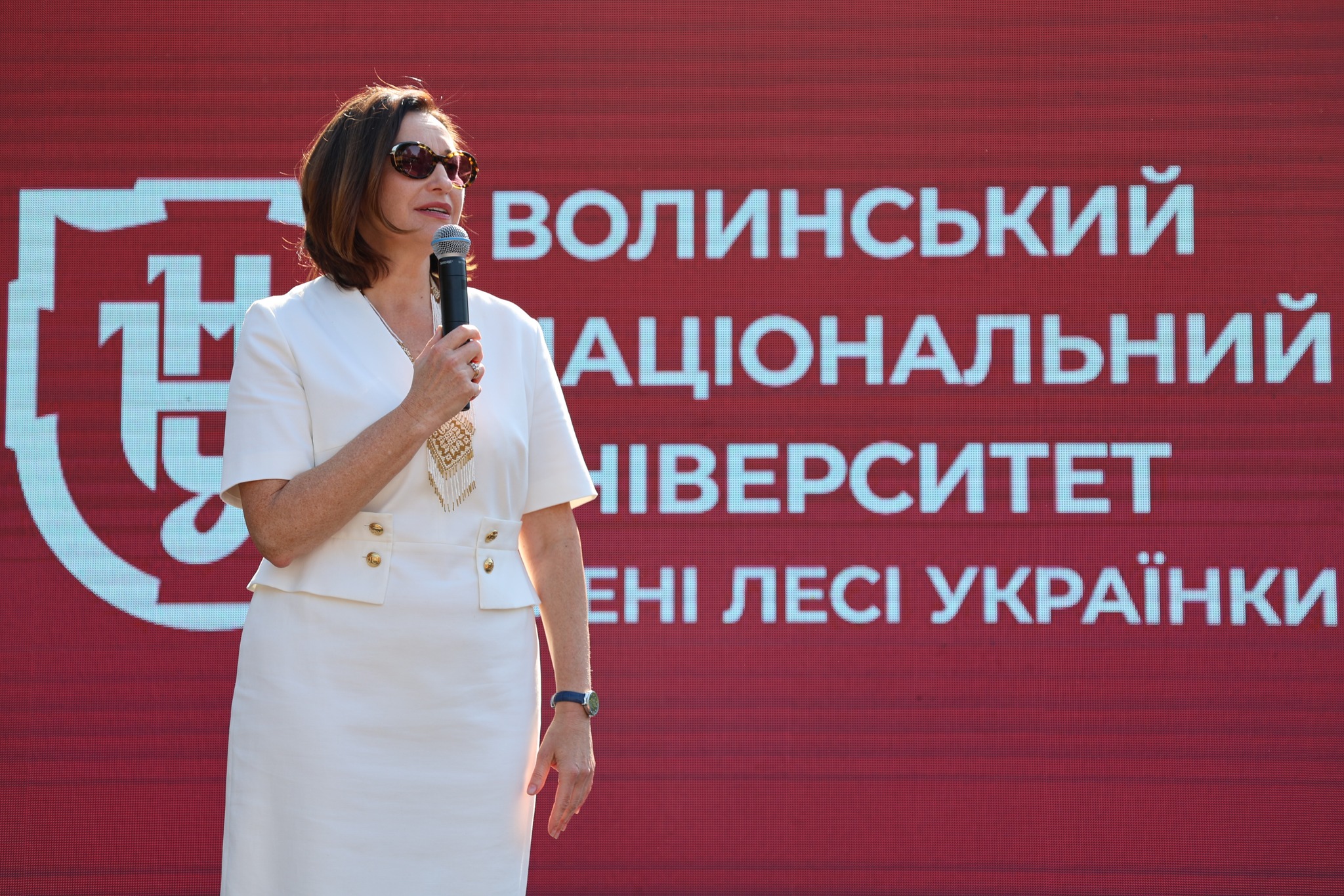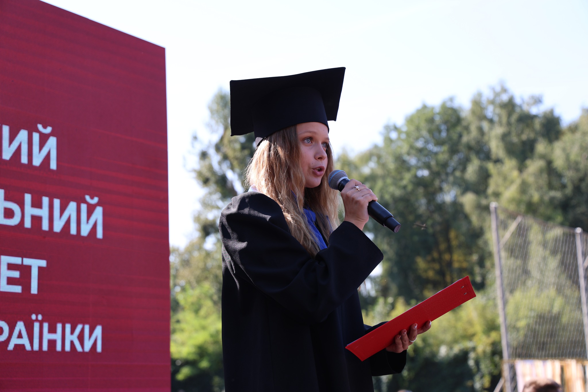 «Ви є тут. І вже цим ви задекларували свою справжню позицію як українські патріоти, як свідомі громадяни. Ті, хто своїм вибором підтримують Україну, Збройні сили України й майбутнє країни. Моє прохання дуже просте – вчіться, вчіться глибоко й серйозно. Тут сьогодні з нами є багато студентів, чиї батьки зараз захищають нашу Вітчизну, чиї рідні поклали свої життя, захищаючи нас і можливість того, щоб у нас було таке свято. Цінуйте їхню жертовність, їхній патріотизм», – акцентувала вона.