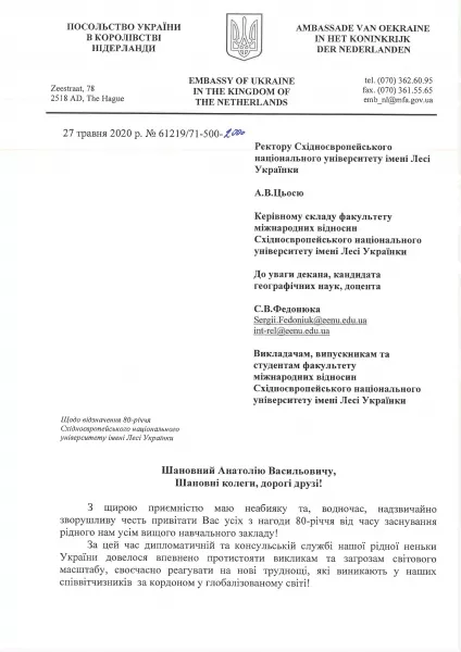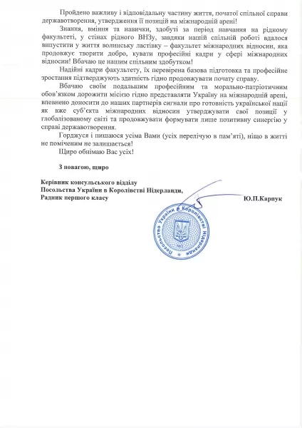 Керівник консульського підрозділу Посольства України в Королівстві Нідерланди, випускник факультету міжнародних відносин нашого вишу Юрій Карпук, вітає Східноєвропейський національний університет імені Лесі Українки з ювілеєм.