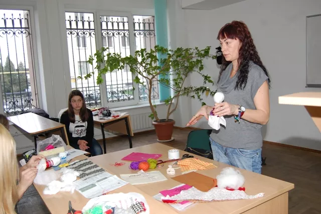 Дівчата виготовляли чи то іграшку, чи то оберіг «На вдале заміжжя». А допомагала їм втілити задумане в мотанках дизайнер Наталія Слюсаревська.