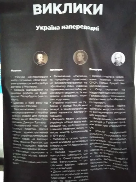 Цілі покоління їхніх послідовників називали мазепинцями, петлюрівцями, бандерівцями. З вуст прихильників і ворогів ці імена звучали однаково пристрасно, перші вкладали в них захоплення і гордість, а другі – страх і ненависть. Вони досі так звучать. Свободолюбність, завзятість, незламність в українцях досі означують як мазепинське, петлюрівське, бандерівське. Ця виставка показує і людський, і символічний вимір цих людей. У цій експозиції йдеться не лише про Мазепу, Петлюру, Бандеру, як про звичайних людей, які були здатні на надзвичайні вчинки, а й про ціле середовище, яке було сформоване довкола них, їхніх послідовників, яких називали мазепинцями, петлюрівцями, бандерівцями».