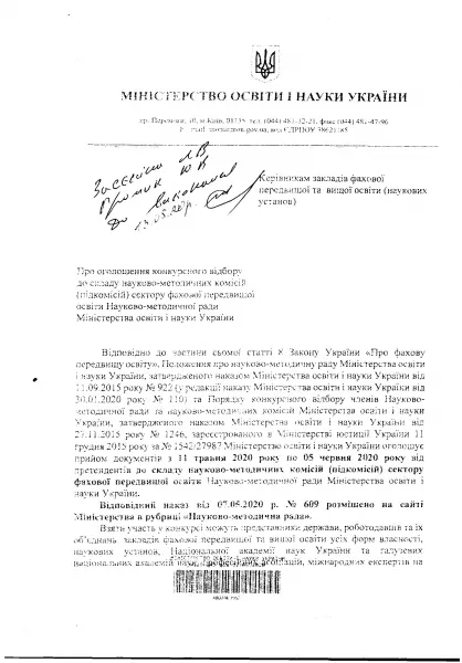 Упродовж 11 травня – 5 червня 2020 року Міністерство освіти і науки України оголосило прийом документів від претендентів до складу науково-методичних комісій (підкомісій) сектора фахової передвищої освіти Науково-методичної ради Міністерства освіти і науки України.