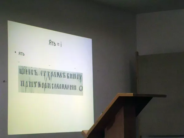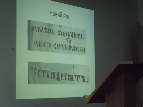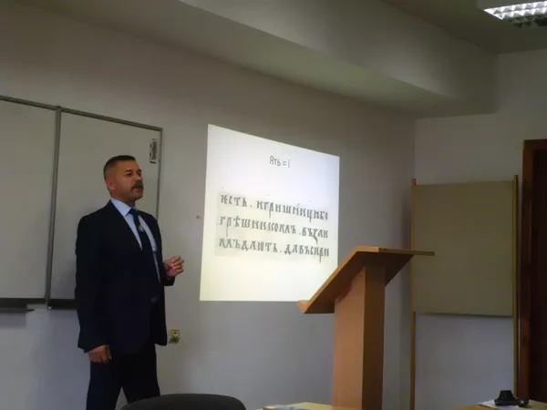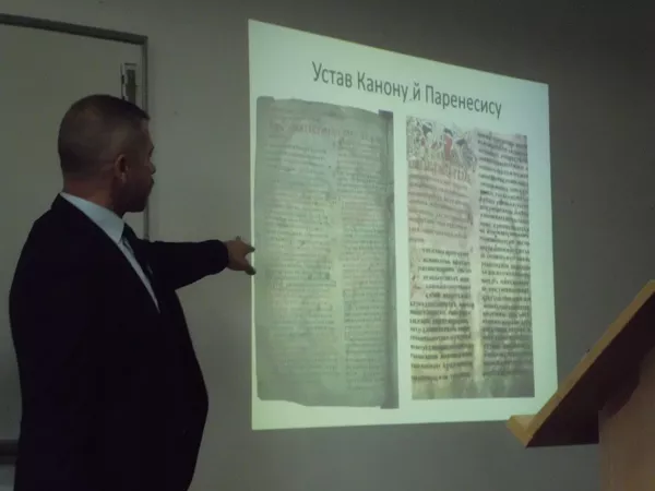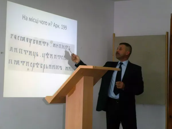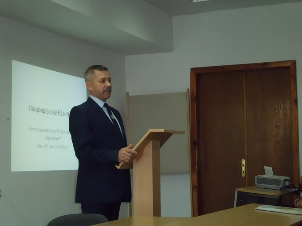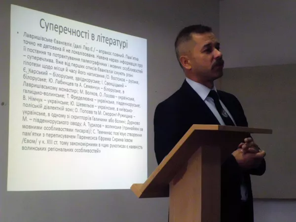 «Хочу аби ви сьогодні знайшли, а не загубили!» – саме так розпочав своє спілкування зі студентством та колегами Віктор Мойсієнко, а продовжив преамбулою про значення писемних пам’яток до яких належить і Лавришівське Євангеліє: «Насправді, мовна присутність кожного етносу у минулому – це справа честі та гідності, знайти десь риси себе, свого духу, якомога глибше. Якщо таких оригінальних пам’яток нема, то маємо масу свідчень, що деякі представники певних етносів намагалися штучно створити такі пам’ятки, відомі у світі фальсифікати, які жили кілька століть, на основі яких захищалися дисертаційні роботи, писалися магістерські та дипломні. А потім виявлялося, що це фальшивка. На щастя в українців збереглися, дякуючи росіянам, дуже багато оригінальних текстів, які й нині перебувають у російських книгосховищах. Тож, хто б що не писав, але якщо риса з писемної пам’ятки підтверджена рисою діалектною – це залізний і бетонний аргумент в історичній діалектології».