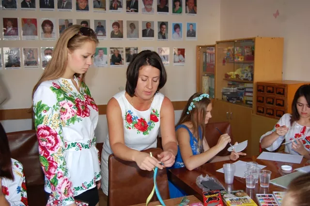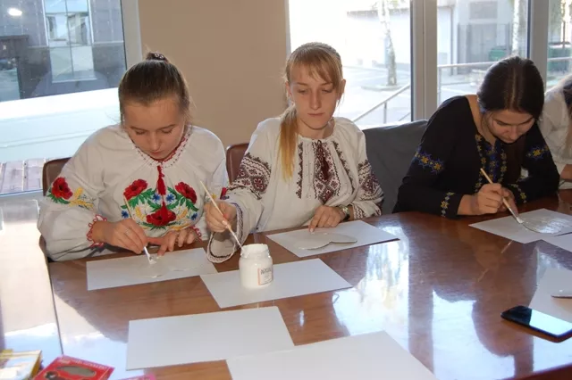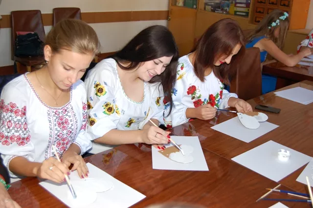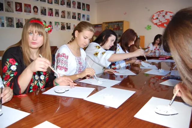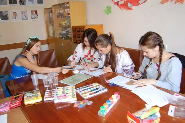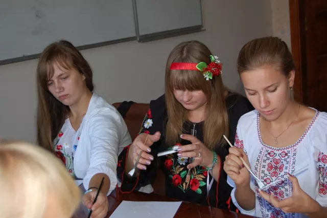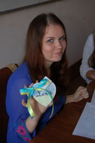 Студенти першого курсу, вбрані у вишиванки, виготовляли патріотичні сувеніри для бійців, котрі нині захищають рубежі нашої країни. До кожного сердечка, розфарбованого в синьо-жовті кольори, учасниці майстер-класу прикріпили листівки з побажаннями військовослужбовцям.