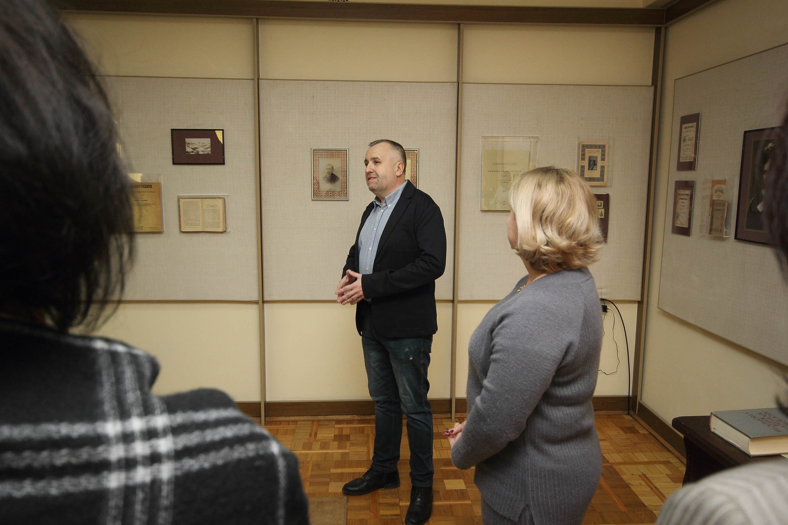 Завідувач кафедри теорії літератури та зарубіжної літератури Сергій Романов виступив із вступним словом і розповів про ідею назви виставки: «Мислителі майбутнього – саме таку назву ми обрали для виставки. Це дуже влучна та точна назва, бо це про те, що творить українську ідею, ті сенси та значення , якими є Україна. Косачі завжди розуміли ким ми є і ким ми можемо стати».