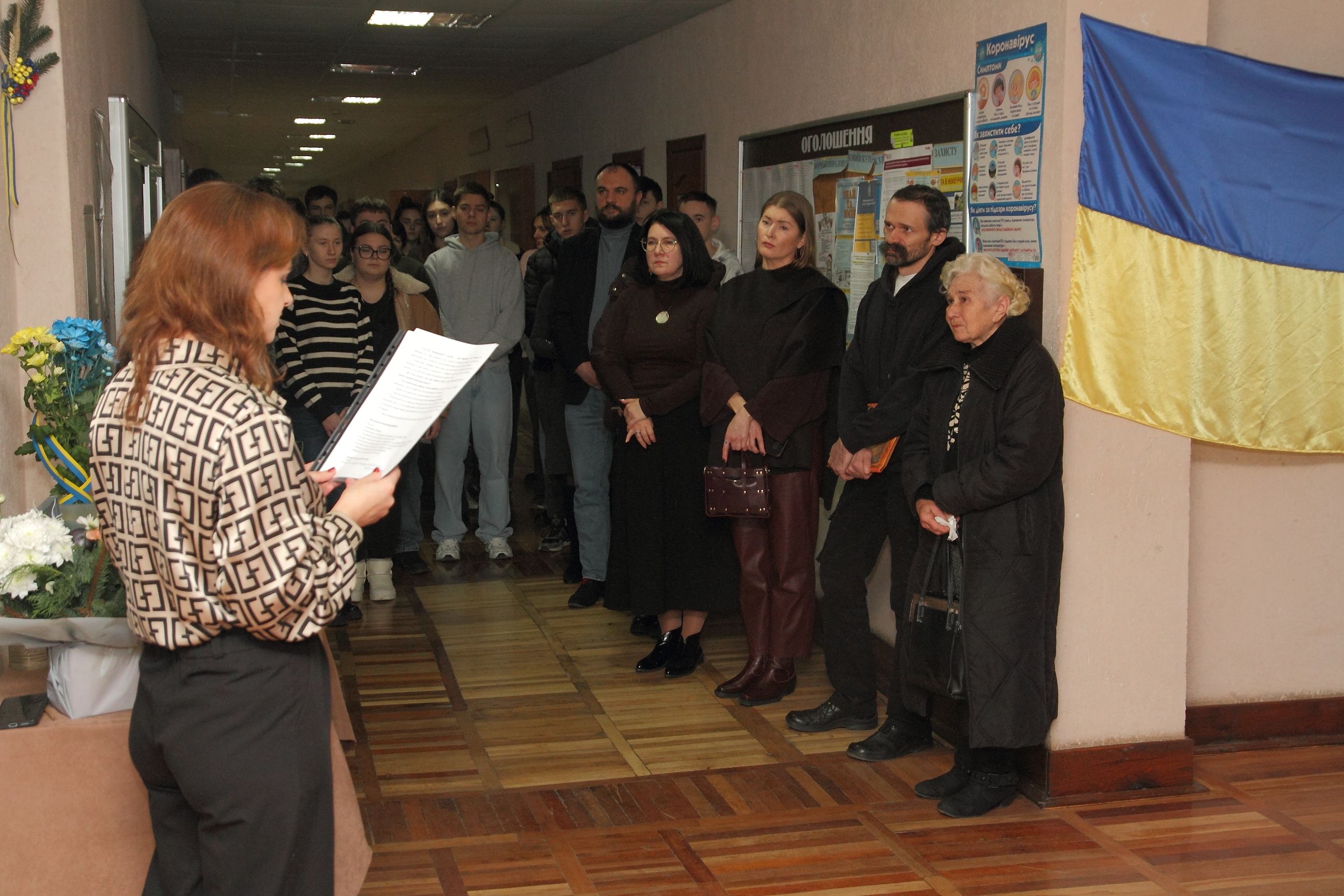 Серед присутніх – проректорка Наталія Благовірна, фахівець Центру з організації базової загальновійськової підготовки Андрій Лев, декан факультету Олена Дмитроца, рідні полеглих захисників, студенти та викладачі.