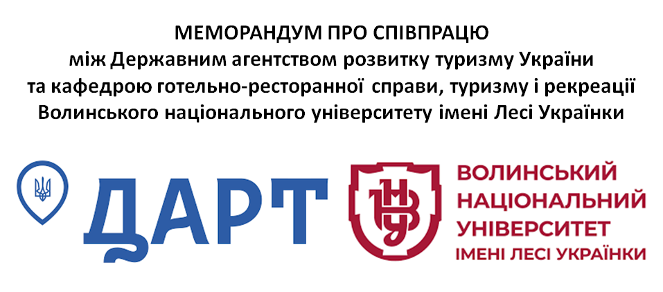 Підписання меморандуму про співпрацю між Державним агентством розвитку туризму України (ДАРТ) та кафедрою готельно-ресторанної справи, туризму і рекреації Волинського національного університету імені Лесі Українки – надзвичайно важлива подія для розвитку туристичної галузі України. Це партнерство відкриває нові можливості для інтеграції теоретичних знань і практичного досвіду, що сприятиме підготовці висококваліфікованих фахівців у сфері туризму та рекреації, готельно-ресторанної справи.