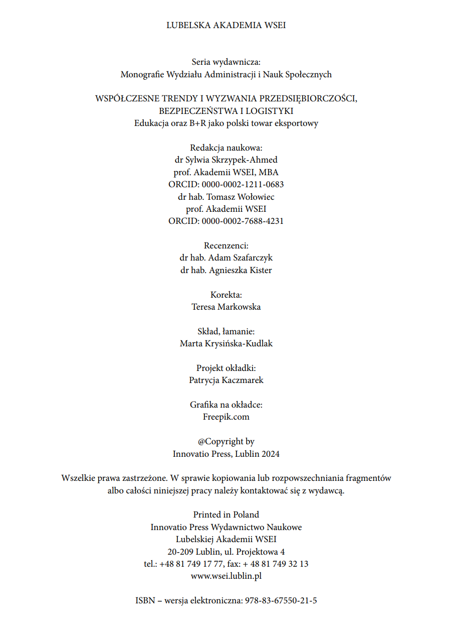 У межах співпраці з відділом адміністрування та соціальних наук Люблінської академії WSEI, університетами та вченими з інших країн у межах реалізації процесів інтернаціоналізації вийшла друком спільна монографія «Współczesne trendy i wyzwania przedsiębiorczości, bezpieczeństwa i logistyki» за редакцією prof. Sylwii Skrzypek-Ahmed, prof. Tomasza Wolowca.