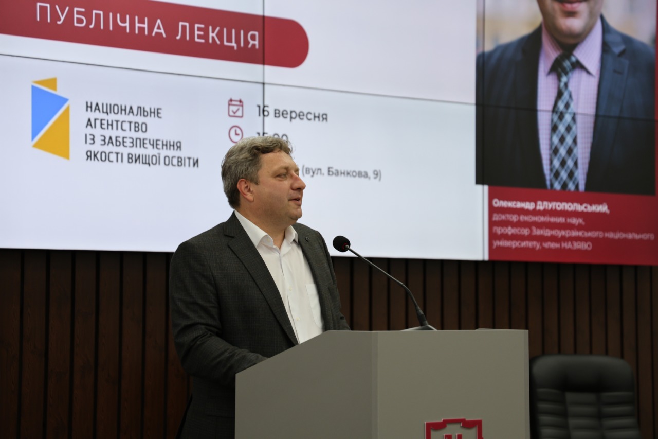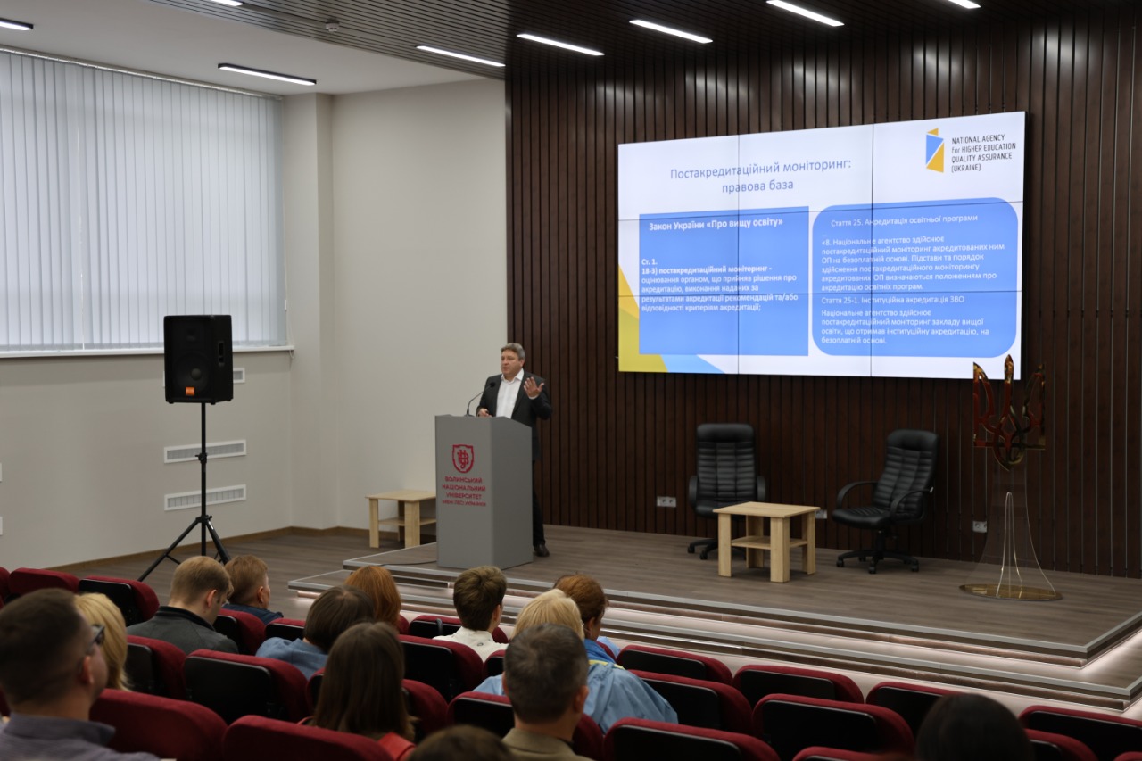 16 вересня 2025 року у Волинському національному університеті імені Лесі Українки відбулася лекція «Постакредитаційний моніторинг освітніх програм: перші пілоти і перші результати». Лектор – Олександр Длугопольський, доктор економічних наук, професор Західноукраїнського національного університету, член Національної агенції забезпечення якості освіти України.